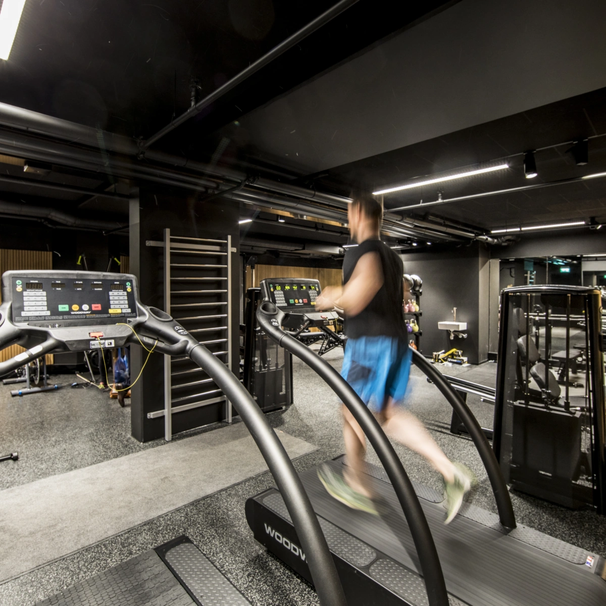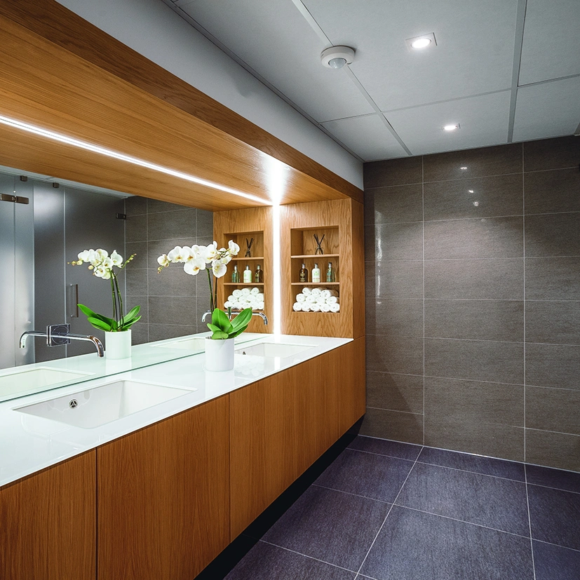 I underetasjen finner du garderober i tilknytning til trimrom og sykkelparkering. Her har du tilgang til dusj, personlige garderobeskap og håndkleservice – alt i et behagelig miljø som legger til rette for en komfortabel treningsopplevelse i hverdagen. Garderobene er også utstyrt med gode hår- og kroppsprodukter. I tillegg til håndkleservicen bidrar dette til å senke terskelen for å benytte sykkel til og fra jobb.