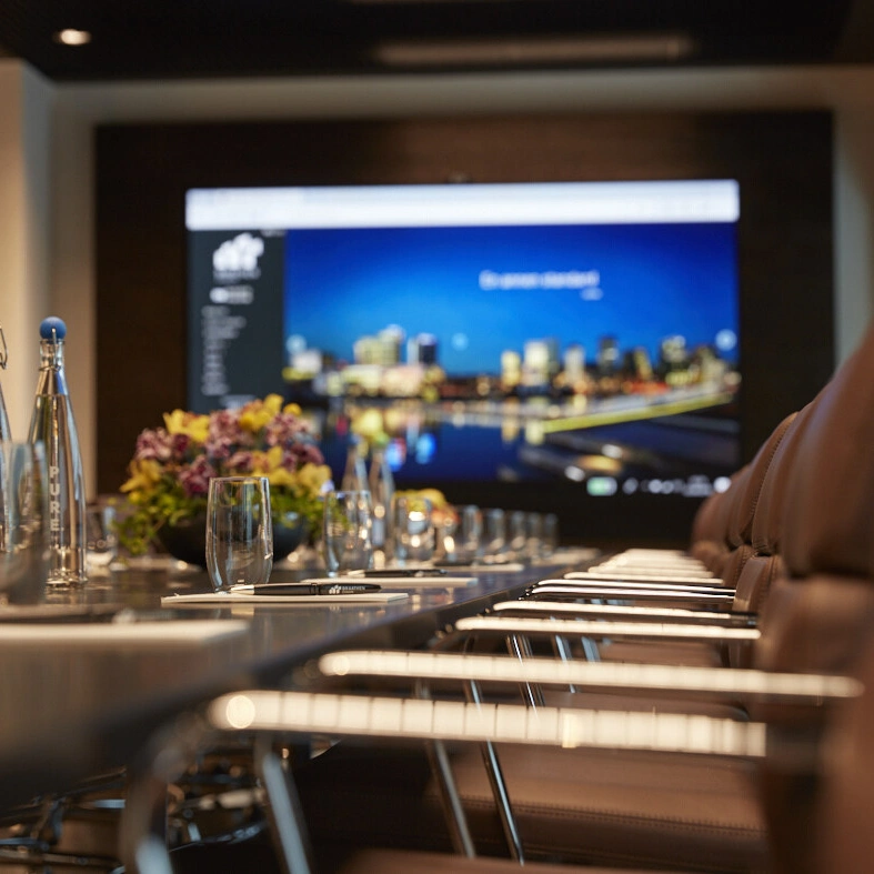 Alle møterommene har fullt videokonferanseutstyr, og kan kombineres med servering, enten i møterommet eller i restaurant Haakon, som ligger på bakkeplan i bygget. Kaffe, te og Pure Water inkludert i prisen.