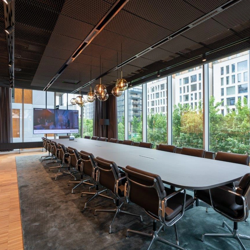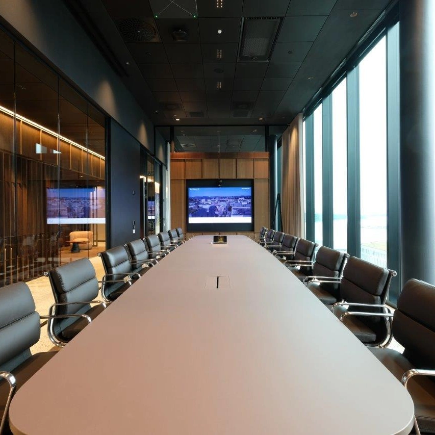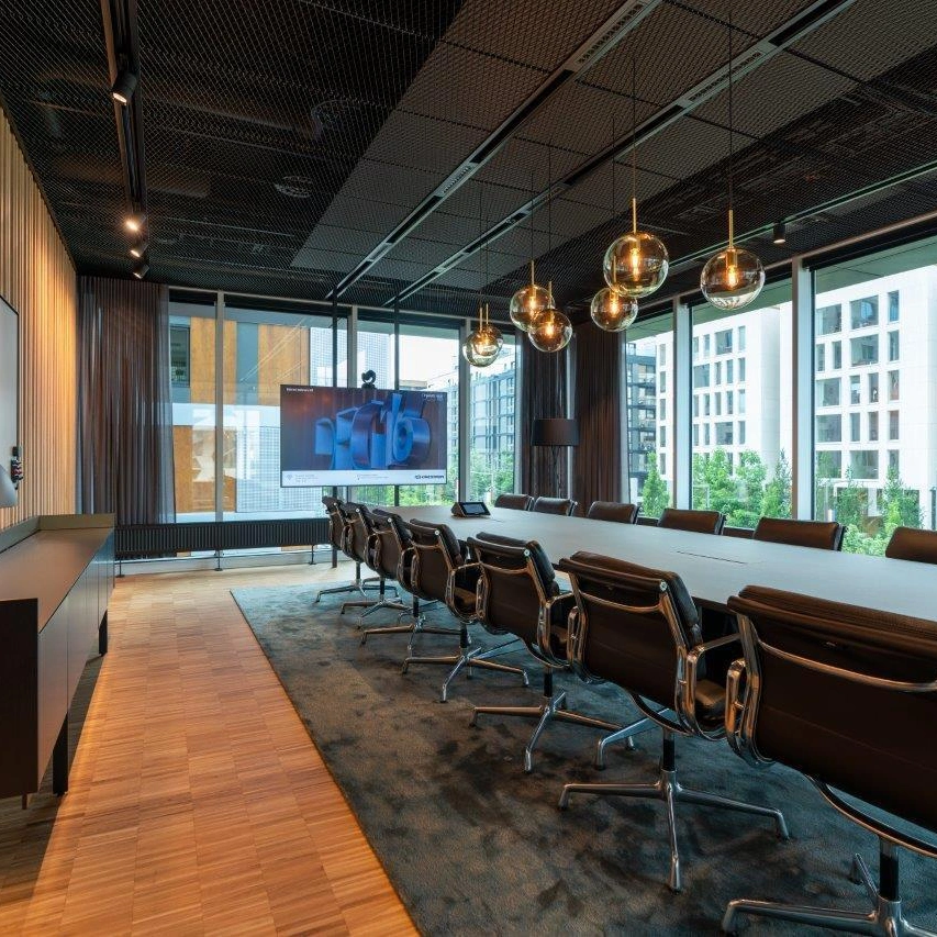 Stort og lyst møterom med utsikt østover mot Barcoderekken med lounge rett utenfor. Rommet er utstyrt med fullt videokonferanseutstyr og inkluderer kaffe, te og Pure Water.
