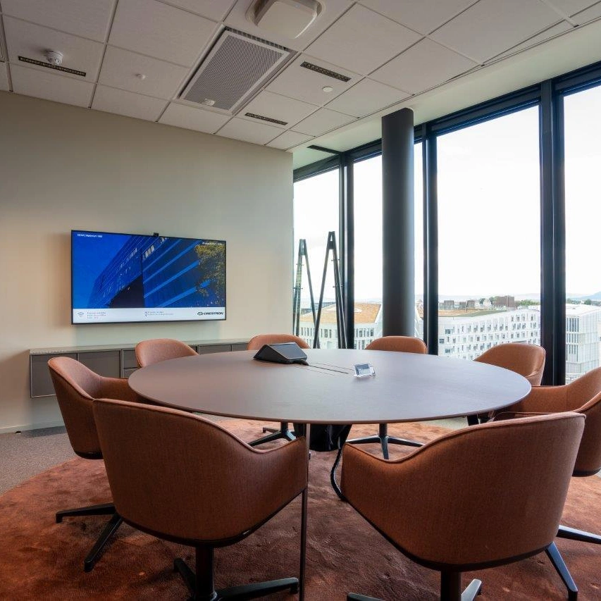 Flott møterom med rundt bord i tilknytning til loungen i 10. etg. Utsikt mot både fjord og by. Rommet er utstyrt med fullt videokonferanseutstyr. Kaffe, te og Pure Water er tilgjengelig.