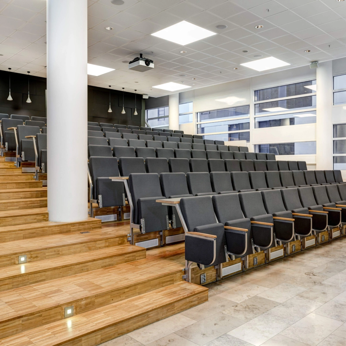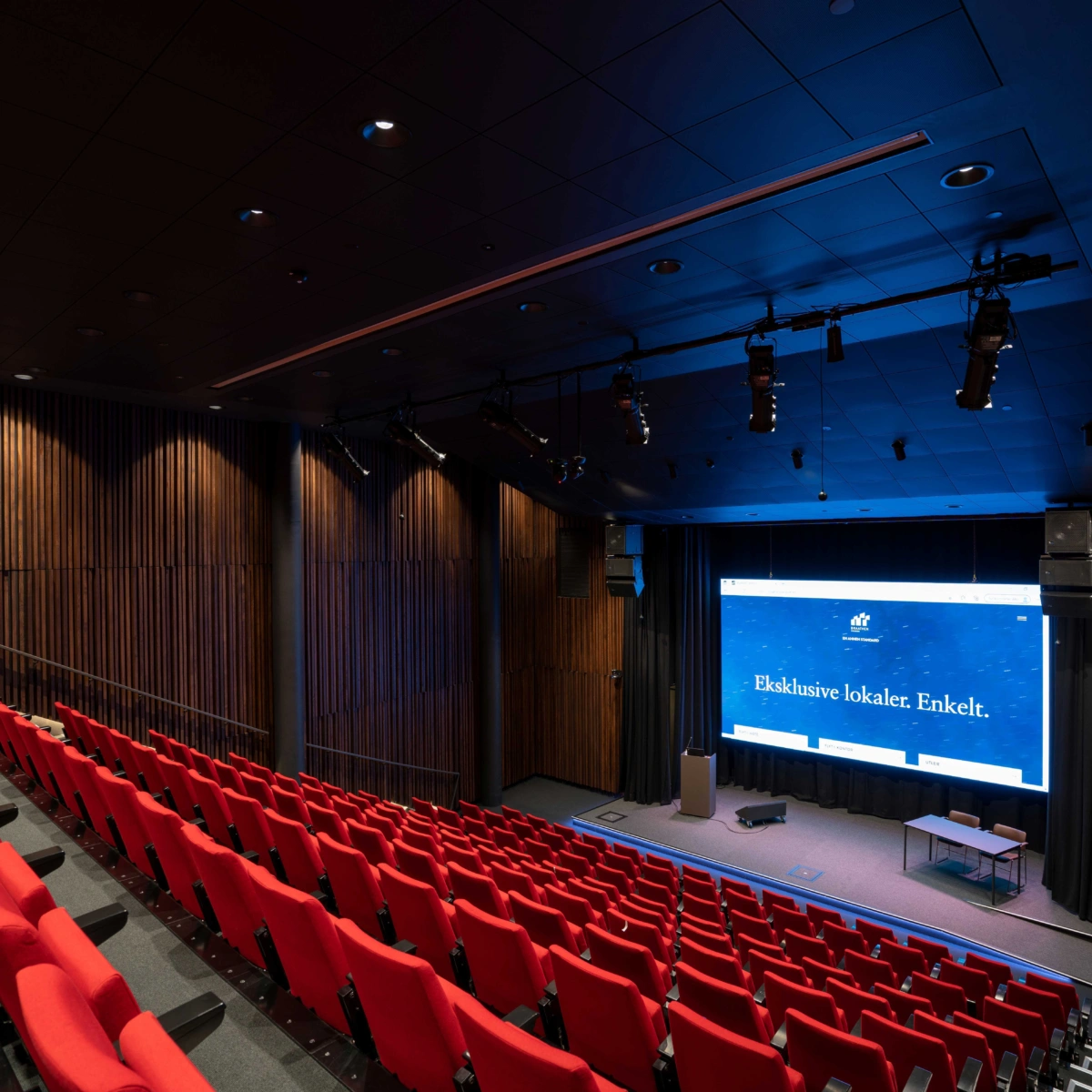 Fantastisk auditorium i 2 etg. med 146 faste sitteplasser, i tillegg er det tre benker øverst i lokalet hvor ca 20 kan få plass. Topp moderne teknisk utstyr med profesjonell sceneteknikk og lys. Videokonferanseutstyr. Tilrettelagt for teknisk utstyr til eventarrangører. Store minglearealer rett utenfor over to etasjer med tilhørende garderobe og toaletter. Kaffe, te og Pure Water i mingleområdene.