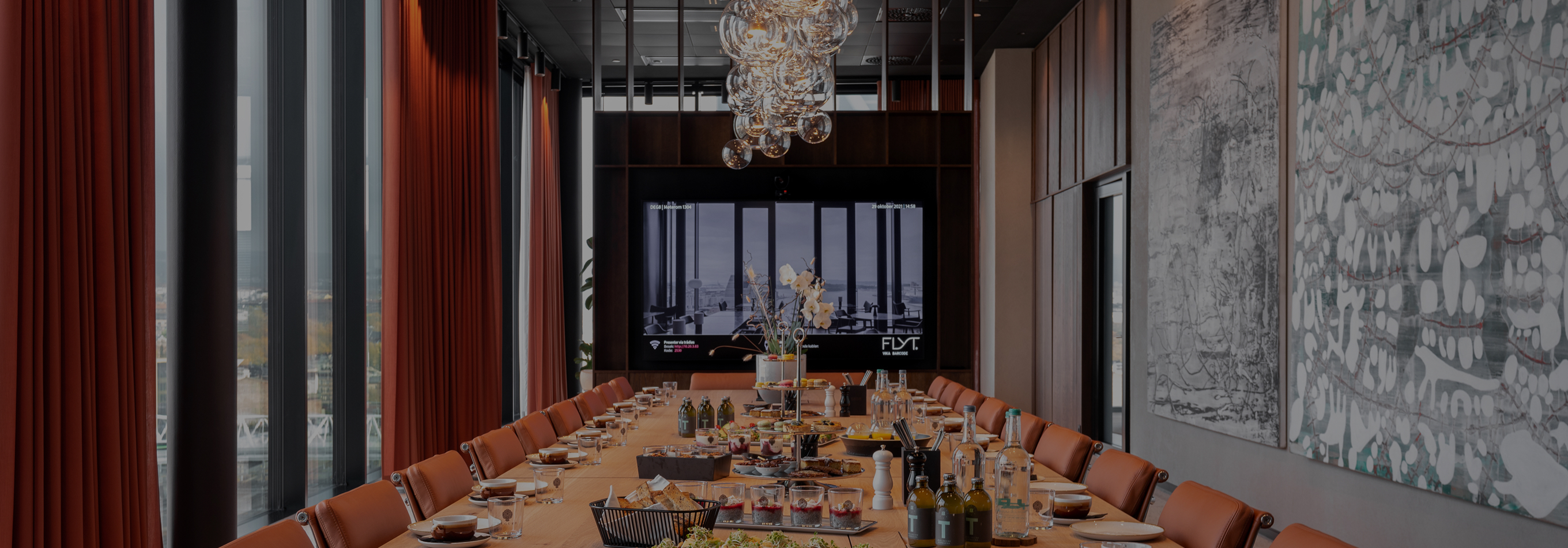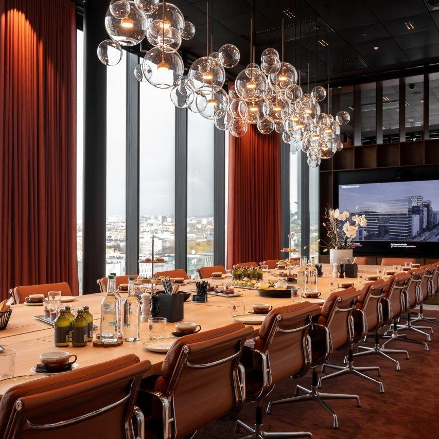 Stort møterom for de viktigste møtene. Glassfasaden med sine fire meter takhøyde sørger for god utsikt over byen og marka. Rommet er møblert med massivt trebord med plass til 22 til møte og 24 til middag. I rommet finner du også egen lounge med anretning. Det er utstyrt med fullt videokonferanseutstyr og inkluderer en servering med kaffe, te og Pure Water ved møtestart. Rommet egner seg godt for en privat forretningslunsj, eller i kombinasjon med lunsj i skybaren.